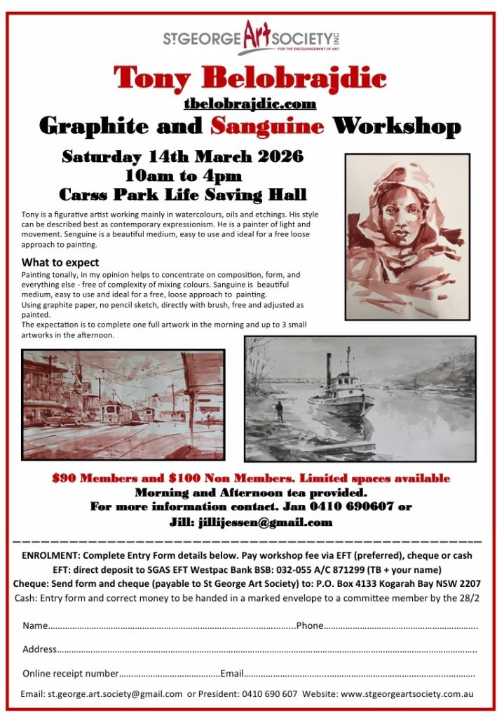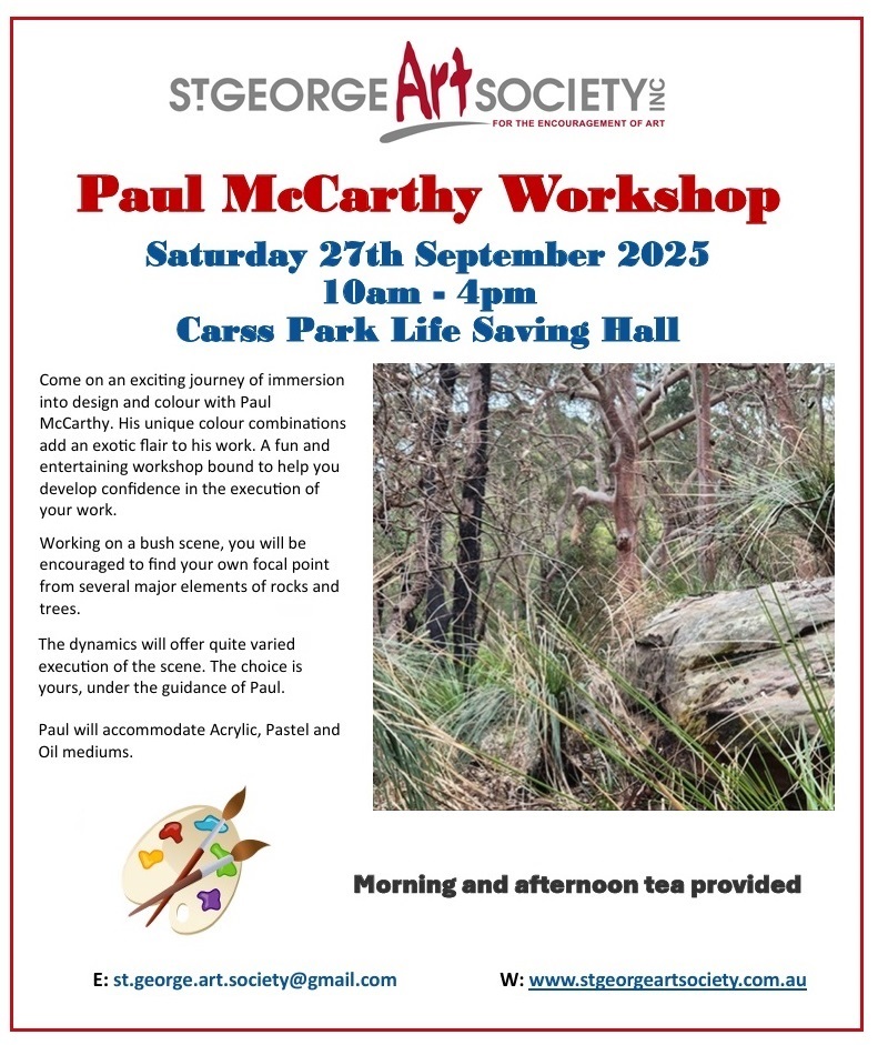 St George Art Societyoffers its members workshops covering a wide range of painting styles and topics throughout the year. These workshops give members a great opportunity to improve their skill level in various mediums and techniques. It is also a great way to meet people who have similar interests.